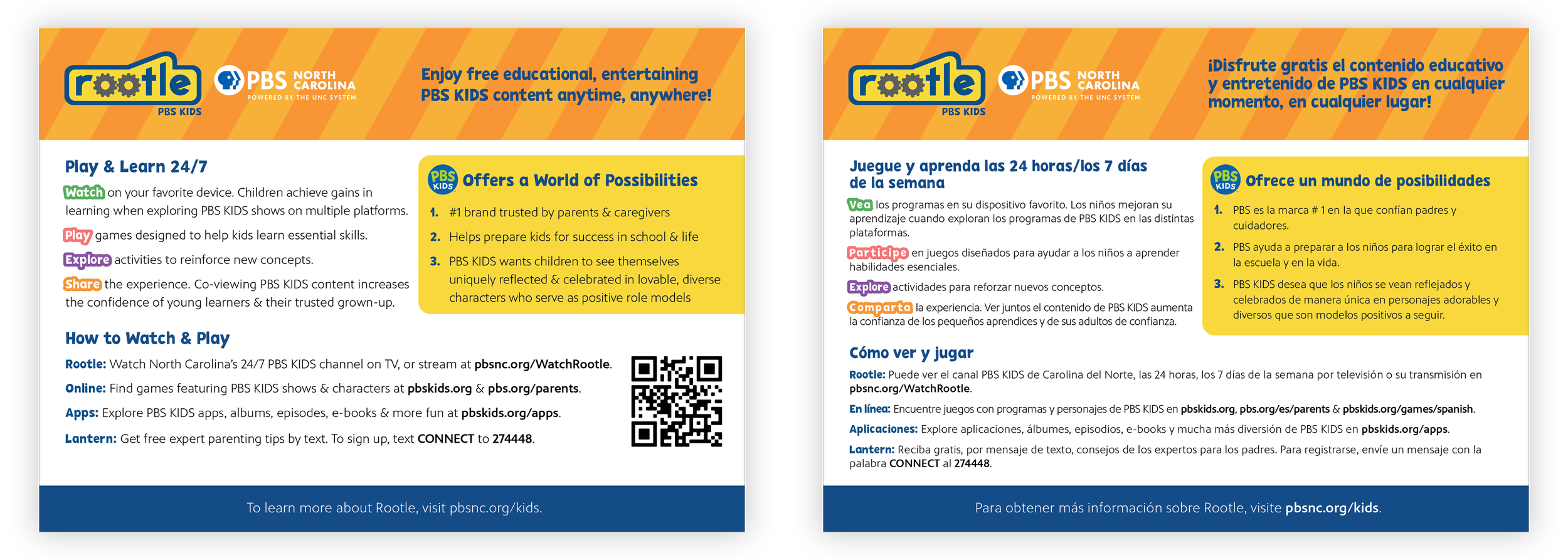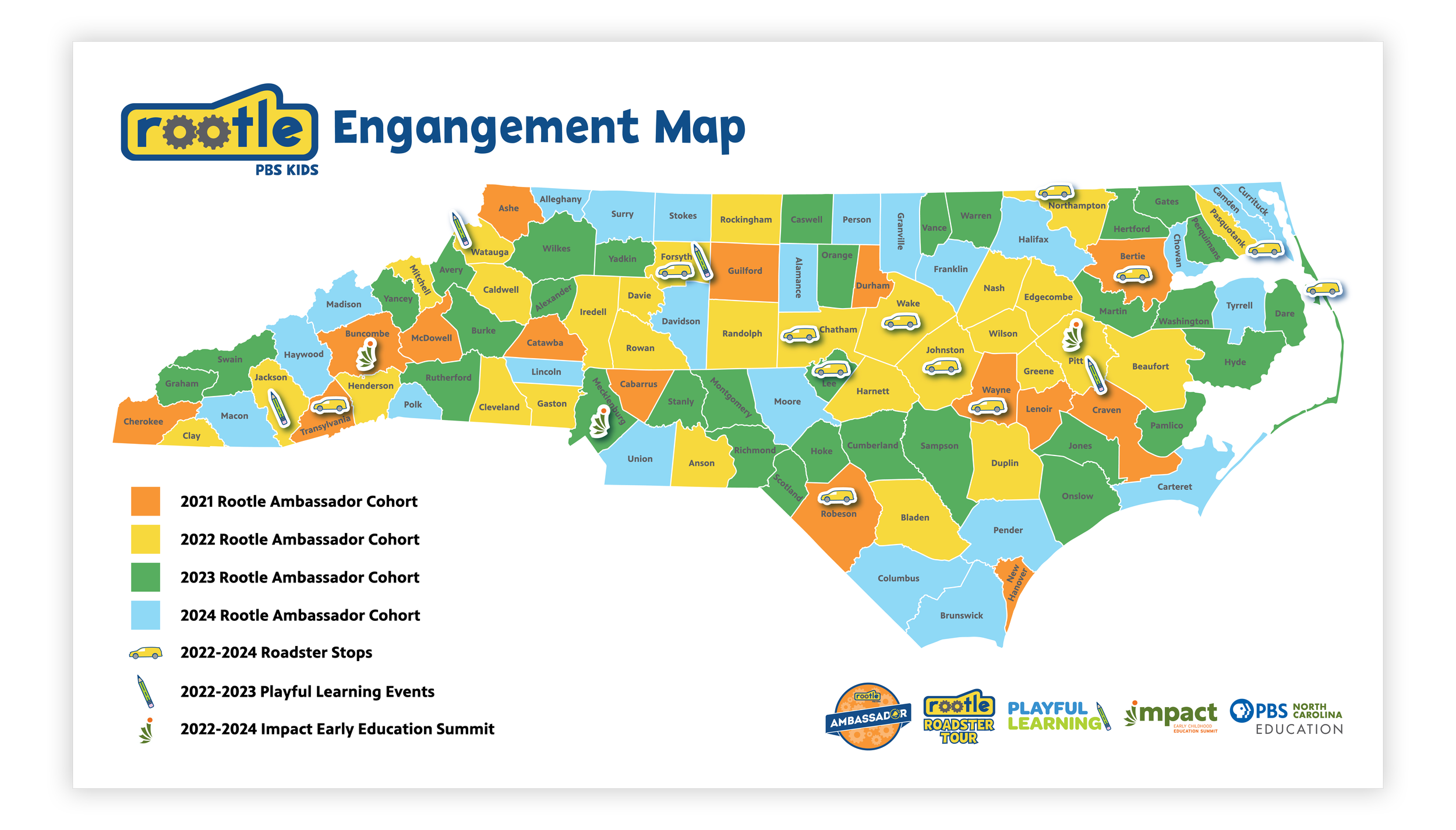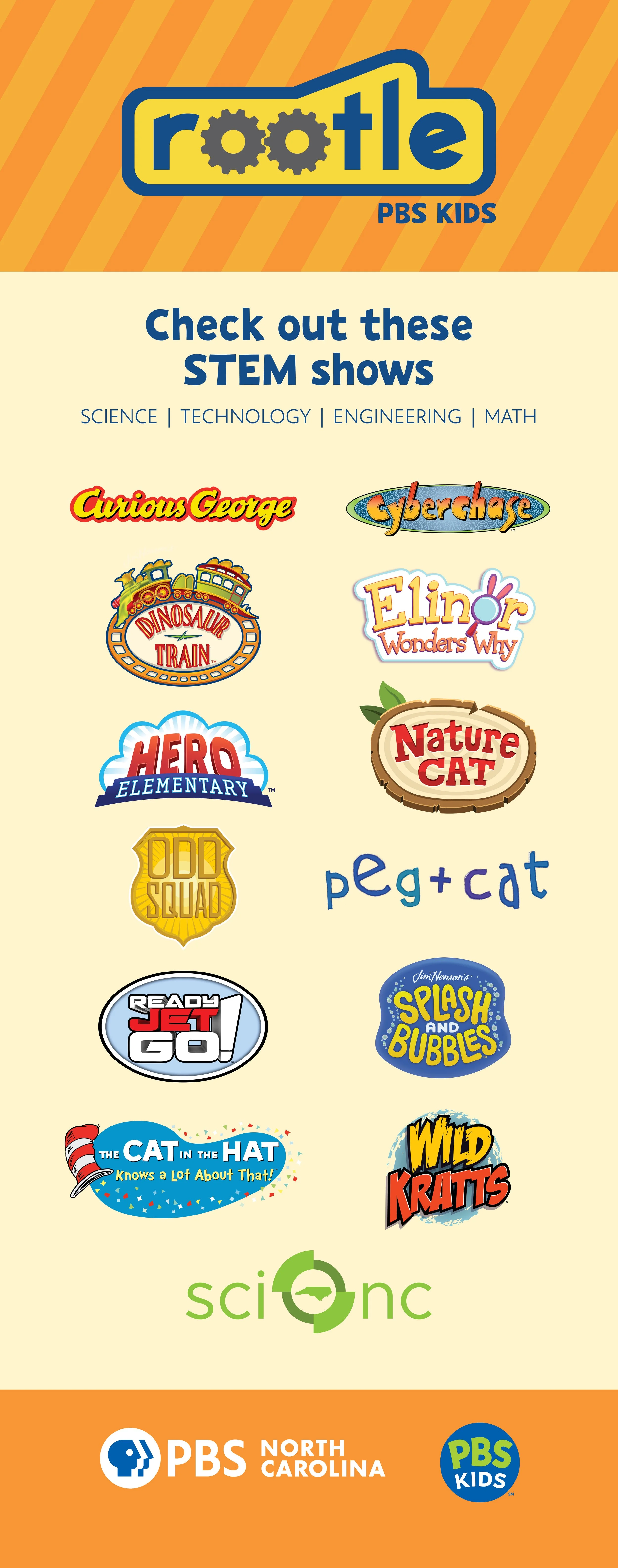 As the lead designer for Rootle, PBS North Carolina’s 24/7 children’s channel, I collaborate with the Education and Innovation department to support the Children’s Media and Engagement team. My responsibilities include maintaining Rootle’s brand identity, developing sub-brands for its various programs, and creating the official Rootle style guide.